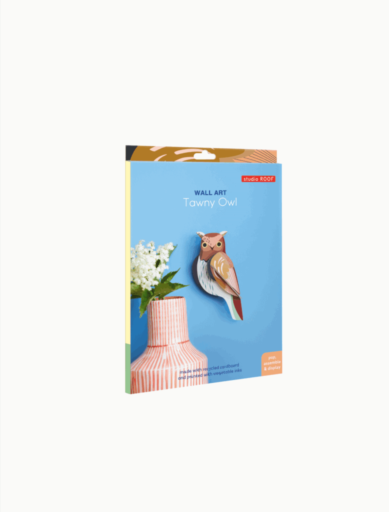Garden birds chirp around us, pecking at some crumbs, glancing around, then fluttering away. They add color to our daily lives. This cardboard Owl won’t fly away and can be given a lovely spot on your wall